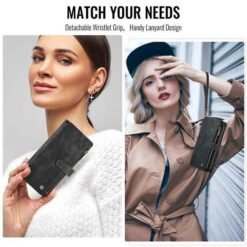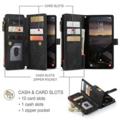 Með hólfum fyrir kreditkort, peningaseðla og smápeninga. Vandað símaveski framleitt af CaseMe úr PU leðurefni og PC plastefni. Hægt er að nota símaveskið sem stand fyrir símann og láta hann standa lárétt á sléttum fleti. Fullt aðgengi að öllum hnöppum og tengjum á símanum.