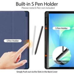 Vandað spjaldtölvuhulstur frá Dux Ducis með höggþolnum hornum sem verja tölvuna fyrir hnjaski. Hægt er að nota hulstrið sem stand fyrir tölvuna sem einnig vaknar eða sofnar þegar hulstrið er opnað eða því lokað. Fullt aðgengi er að öllum hnöppum og tengjum á tölvunni.