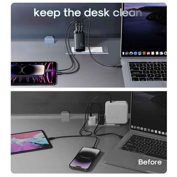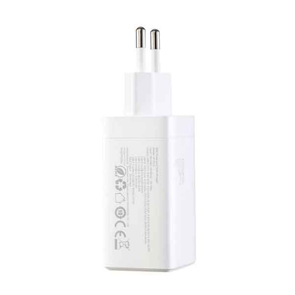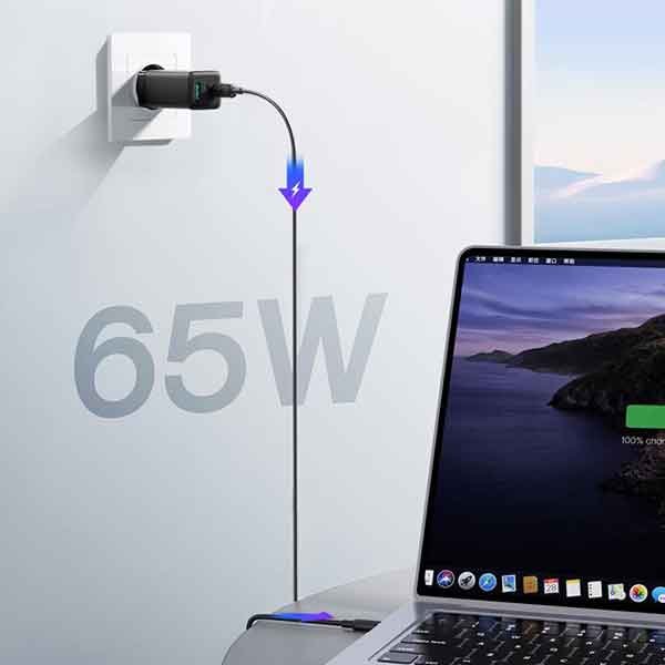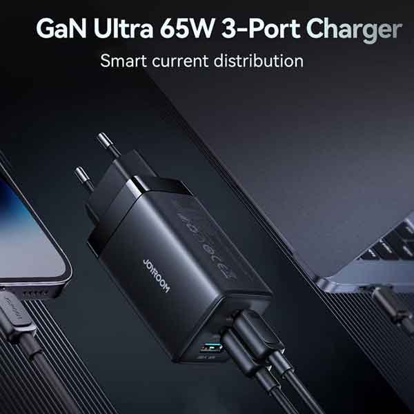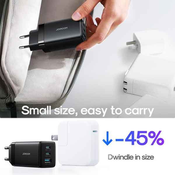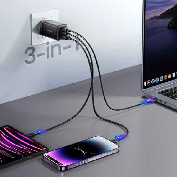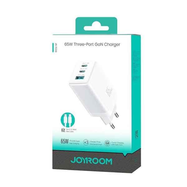 67W GaN vegghleðslutæki frá Joyroom sem auðelt er að taka með sér. Með 3 tengjum (eitt USB og tvö USB-C) er hægt að hlaða 3 tæki í einu. Með þessu öfluga hleðslutæki tekur hleðslan allt að 10 sinnum skemmri tíma. Hleðslutækinu fylgir 1,2M USB-C í USB-C kapall.