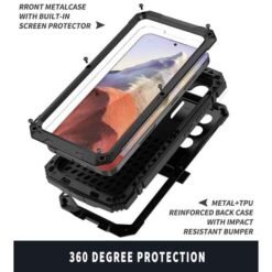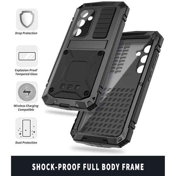 Full Armor högg, ryk og vantsvarið símahulstur með skjávörn, gleri yfir myndavél og innbyggðum borðstandi. Samlokuhulstur(hulstrið er lokað) og fest saman með skrúfum. Skrúfjárn fylgir með. Sérstyrkt horn, skjávörn og hækkaðar brúnir við myndavélalinsu. Styður MagSafe þráðlausa hleðslu. Hulstrið ver símann fyrir höggum, rispum, hnjaski og sliti.