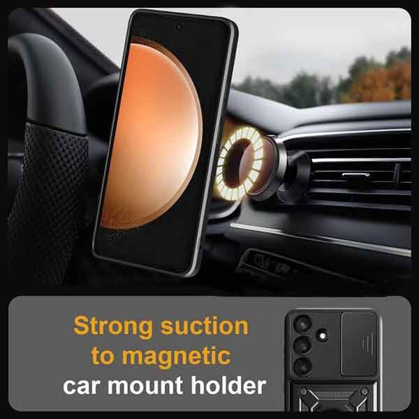 Á bakhlið hulstursins er málmhringur eða fingrahringur sem auðveldar þér enn frekar að halda á símanum. Inni í hringnum er málmplata sem hægt er að nota til að festa hann við segulfestingu á sléttum fleti eða í bíl. Hringinn er einnig hægt að nota til að láta símann standa láréttan á sléttum fleti.
