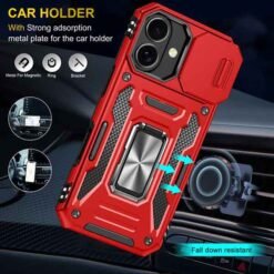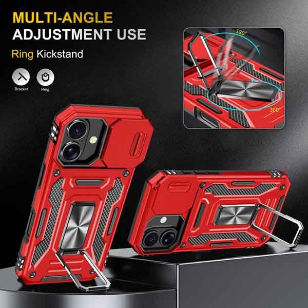 - Aukamöguleikar: Hringur með innbyggðri málmplötu og áföstum málmhring sem hægt er að snúa 360 gráður, nota sem stand fyrir símann eða auka gripið. Innbyggð málmplata til festingar við bíla eða borðfestingar. Linsuhlíf