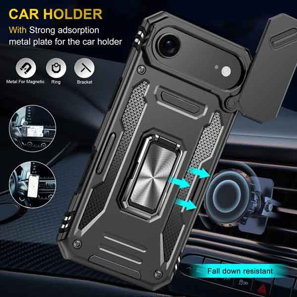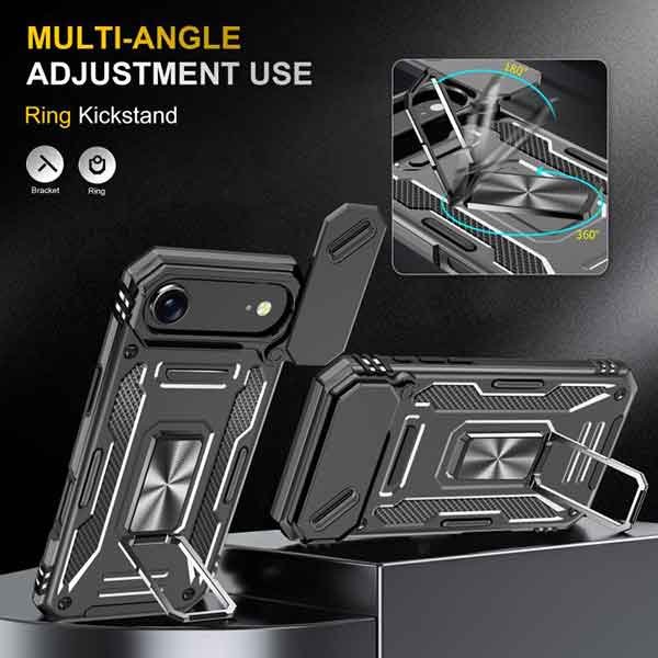 - Aukamöguleikar: Hringur með innbyggðri málmplötu og áföstum málmhring sem hægt er að snúa 360 gráður, nota sem stand fyrir símann eða auka gripið. Innbyggð málmplata til festingar við bíla eða borðfestingar. Linsuhlíf