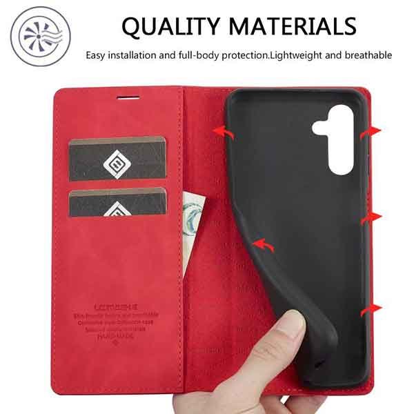 Þetta símaveski fyrir Galaxy A56 farsíma er ekki aðeins hannað til að gera þér mögulegt að nota það sem peningaveski og geyma í því greiðslukort og peningaseðla. Það veitir símanum þínum einnig vörn fyrir rispum og hnjaski. Gripið á símanum verður einnig betra og líkurnar á því að hann „renni“ úr greipum þér eru minni.