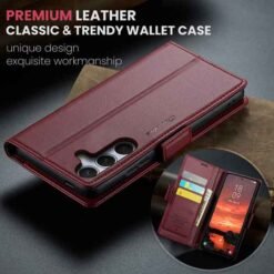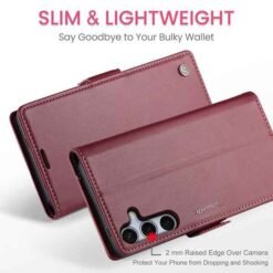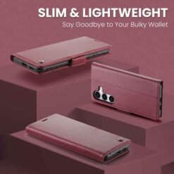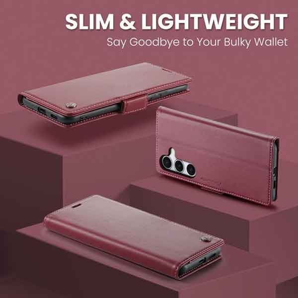 Þetta símaveski fyrir Galaxy S25 FE farsíma er ekki aðeins hannað til að gera þér mögulegt að nota það sem peningaveski og geyma í því greiðslukort og peningaseðla. Það veitir símanum þínum einnig vörn fyrir rispum og hnjaski. Gripið á símanum verður einnig betra og líkurnar á því að hann „renni“ úr greipum þér eru minni.