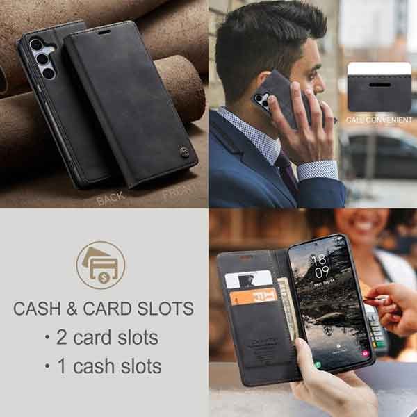 Þetta símaveski fyrir Galaxy S25 FE farsíma er ekki aðeins hannað til að gera þér mögulegt að nota það sem peningaveski og geyma í því greiðslukort og peningaseðla. Það veitir símanum þínum einnig vörn fyrir rispum og hnjaski. Gripið á símanum verður einnig betra og líkurnar á því að hann „renni“ úr greipum þér eru minni.