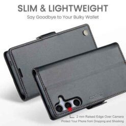 Þetta símaveski fyrir Galaxy S25 FE farsíma er ekki aðeins hannað til að gera þér mögulegt að nota það sem peningaveski og geyma í því greiðslukort og peningaseðla. Það veitir símanum þínum einnig vörn fyrir rispum og hnjaski. Gripið á símanum verður einnig betra og líkurnar á því að hann „renni“ úr greipum þér eru minni.
