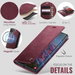 með hólfum fyrir kreditkort og peningaseðla. Vandað símaveski framleitt af CaseMe úr hágæða PU leðurefni og PC plastefni með aflosanlegu símahulstri sem er fest með segli við veskið. Hægt er að nota símaveskið sem stand fyrir símann og láta hann standa lárétt á sléttum fleti. Fullt aðgengi að öllum hnöppum og tengjum á símanum. Innbyggð RFID þjófavörn.