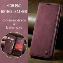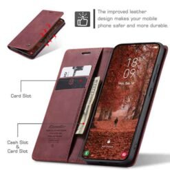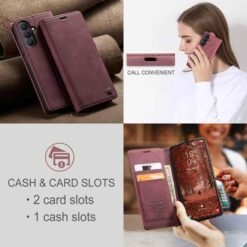 með hólfum fyrir kreditkort og peningaseðla. Vandað símaveski framleitt af CaseMe úr hágæða PU leðurefni og PC plastefni. Hægt er að nota símaveskið sem stand fyrir símann og láta hann standa lárétt á sléttum fleti. Fullt aðgengi að öllum hnöppum og tengjum á símanum.