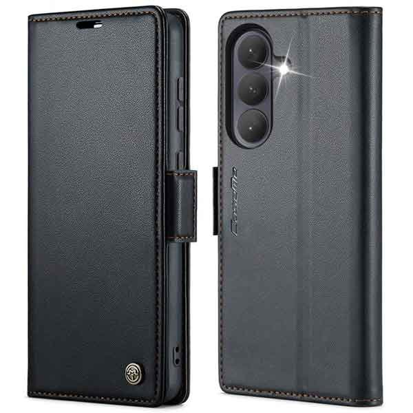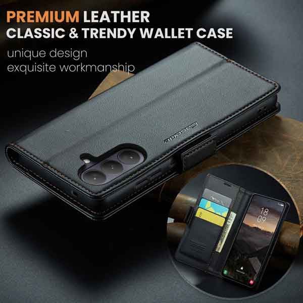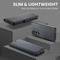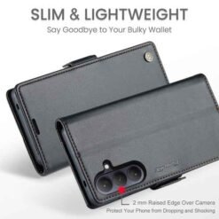 Þetta símaveski fyrir Galaxy S26 farsíma er ekki aðeins hannað til að gera þér mögulegt að nota það sem peningaveski og geyma í því greiðslukort og peningaseðla. Það veitir símanum þínum einnig vörn fyrir rispum og hnjaski. Gripið á símanum verður einnig betra og líkurnar á því að hann „renni“ úr greipum þér eru minni.