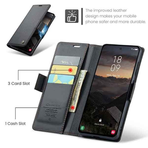 með hólfum fyrir kreditkort og peningaseðla. Vandað símaveski framleitt af CaseMe úr hágæða PU leðurefni og PC plastefni. Hægt er að nota símaveskið sem stand fyrir símann og láta hann standa lárétt á sléttum fleti. Fullt aðgengi að öllum hnöppum og tengjum á símanum. Innbyggð RFID þjófavörn.