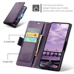með hólfum fyrir kreditkort og peningaseðla. Vandað símaveski framleitt af CaseMe úr hágæða PU leðurefni og PC plastefni. Hægt er að nota símaveskið sem stand fyrir símann og láta hann standa lárétt á sléttum fleti. Fullt aðgengi að öllum hnöppum og tengjum á símanum. Innbyggð RFID þjófavörn.