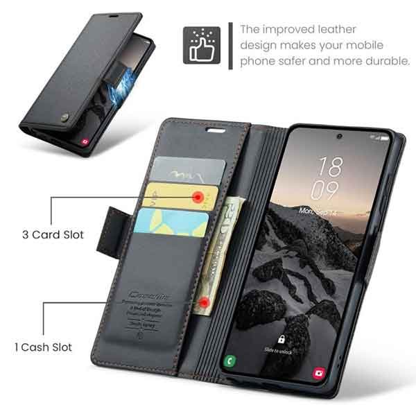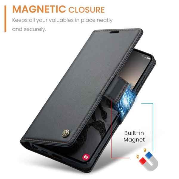 með hólfum fyrir kreditkort og peningaseðla. Vandað símaveski framleitt af CaseMe úr hágæða PU leðurefni og PC plastefni. Hægt er að nota símaveskið sem stand fyrir símann og láta hann standa lárétt á sléttum fleti. Fullt aðgengi að öllum hnöppum og tengjum á símanum. Innbyggð RFID þjófavörn.