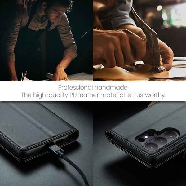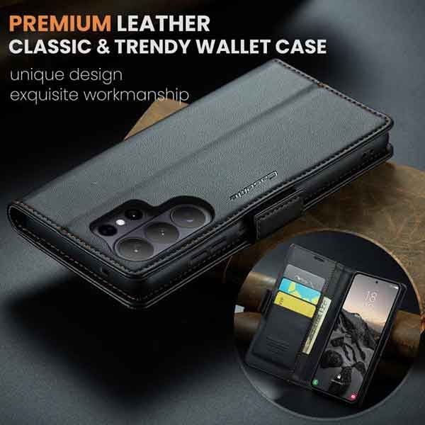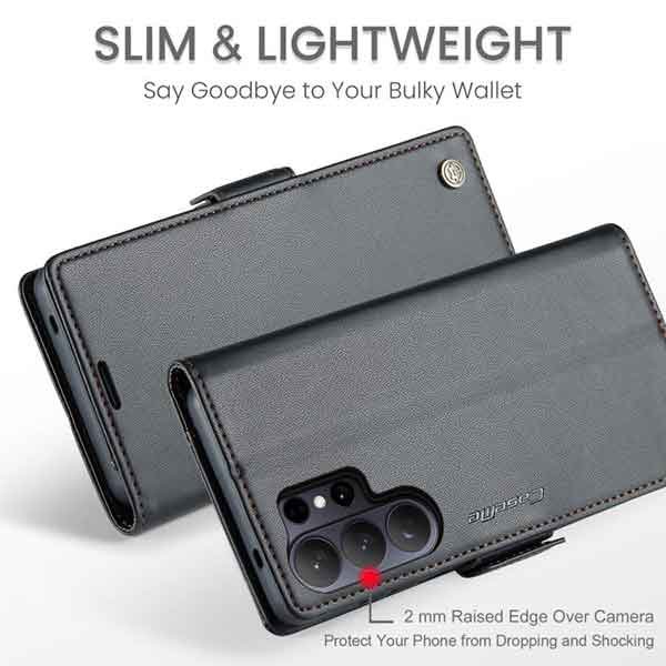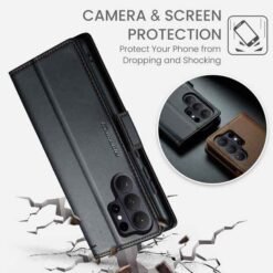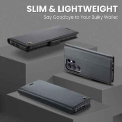 Þetta símaveski fyrir Galaxy S26 ultra farsíma er ekki aðeins hannað til að gera þér mögulegt að nota það sem peningaveski og geyma í því greiðslukort og peningaseðla. Það veitir símanum þínum einnig vörn fyrir rispum og hnjaski. Gripið á símanum verður einnig betra og líkurnar á því að hann „renni“ úr greipum þér eru minni.