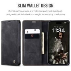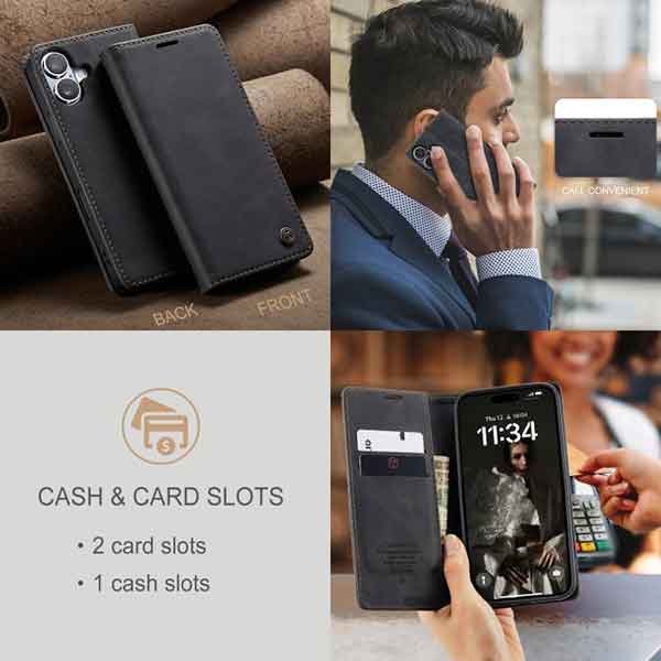 Þetta símaveski fyrir iPhone 17 farsíma er ekki aðeins hannað til að gera þér mögulegt að nota það sem peningaveski og geyma í því greiðslukort og peningaseðla. Það veitir símanum þínum einnig vörn fyrir rispum og hnjaski. Gripið á símanum verður einnig betra og líkurnar á því að hann „renni“ úr greipum þér eru minni.