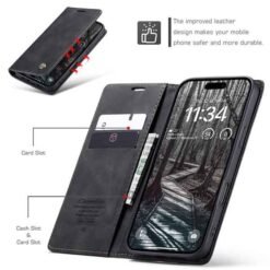 með hólfum fyrir kreditkort og peningaseðla. Vandað símaveski, framleitt af CaseMe úr hágæða PU leðurefni og PC plastefni. Hægt er að nota símaveskið sem stand fyrir símann og láta hann standa lárétt á sléttum fleti. Fullt aðgengi að öllum hnöppum og tengjum á símanum.