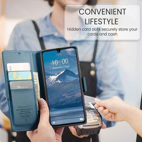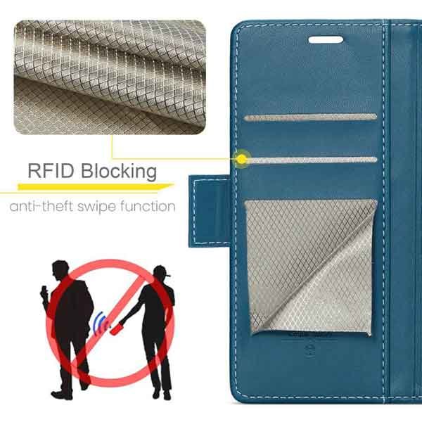 með hólfum fyrir kreditkort og peningaseðla. Vandað símaveski framleitt af CaseMe úr hágæða PU leðurefni og PC plastefni. Hægt er að nota símaveskið sem stand fyrir símann og láta hann standa lárétt á sléttum fleti. Fullt aðgengi að öllum hnöppum og tengjum á símanum. Innbyggð RFID þjófavörn.