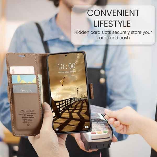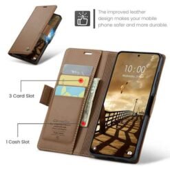 með hólfum fyrir kreditkort og peningaseðla. Vandað símaveski framleitt af CaseMe úr hágæða PU leðurefni og PC plastefni. Hægt er að nota símaveskið sem stand fyrir símann og láta hann standa lárétt á sléttum fleti. Fullt aðgengi að öllum hnöppum og tengjum á símanum.