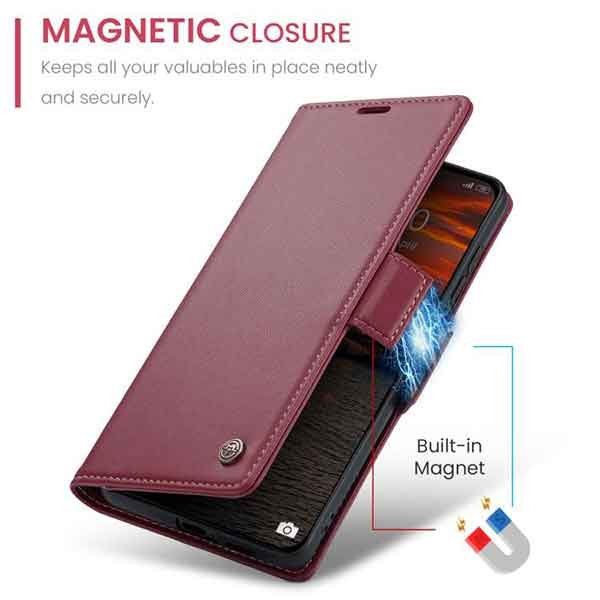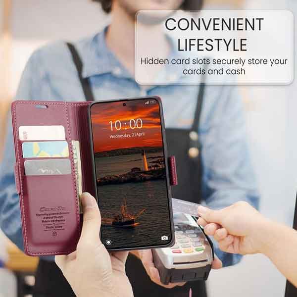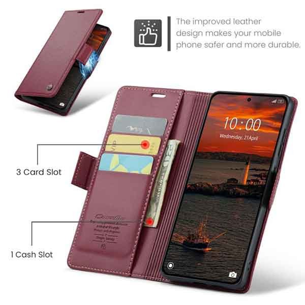 með hólfum fyrir kreditkort og peningaseðla. Vandað símaveski framleitt af CaseMe úr hágæða PU leðurefni og PC plastefni. Hægt er að nota símaveskið sem stand fyrir símann og láta hann standa lárétt á sléttum fleti. Fullt aðgengi að öllum hnöppum og tengjum á símanum.