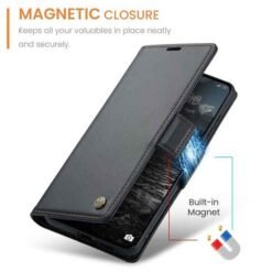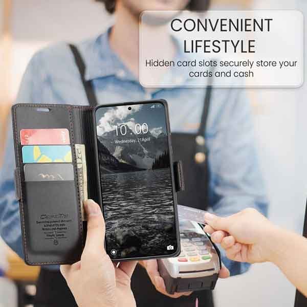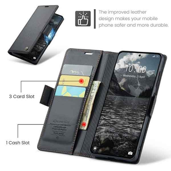 með hólfum fyrir kreditkort og peningaseðla. Vandað símaveski framleitt af CaseMe úr hágæða PU leðurefni og PC plastefni. Hægt er að nota símaveskið sem stand fyrir símann og láta hann standa lárétt á sléttum fleti. Fullt aðgengi að öllum hnöppum og tengjum á símanum.